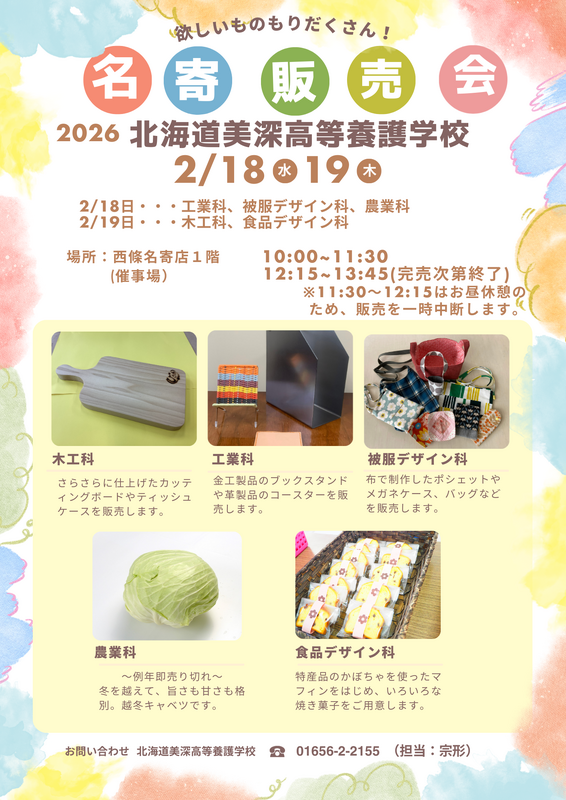 次の日程で、北海道美深高等養護学校製品販売会を開催します。多くの皆様のお越しをお待ちしております。