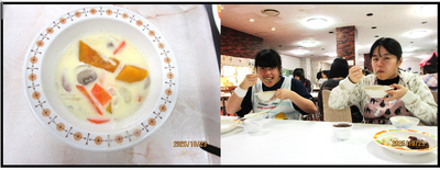 学校給食と寄宿舎給食で、みそ汁、煮物、チーズ焼きなどで秋の味覚のかぼちゃを味わっています。この日は、気温が3℃と冷え込みましたが、温かい「かぼちゃシチュー」で心も体もほっこりしました。