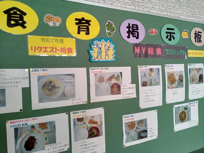 今年度、食育の一環として『MY給食プロジェクト ~食べたいをカタチにしよう!~』に取り組んでいます。この取組は、生徒のみなさんに「リクエストメニュー」を考えてもらい、そのリクエストに対して栄養教諭が栄養価や食材などのバランスについてアドバイスをしながら実際の給食のメニューとして提供するものです。