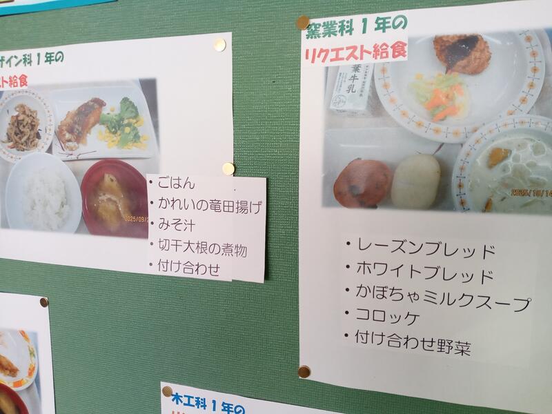 生徒のみなさんがメニューを考えるにあたっては、「季節の食材」「世界の料理」「道産食材」「とにかく好きなメニュー」などのテーマを参考にしながら、主食、主菜、副菜、汁物について、一人一人がメニューを熟考しています。「食べるだけじゃなく、自分たちで食をプロデュースする。」そんな特別な体験をみんなで楽しみ、同時に食生活についての学びもありながら給食の時間を過ごしています。日々の給食の中で、「今日のメニューは私が考えました!」とか「次回は僕が考えたメニューだよ!」などの声が行き交っています。