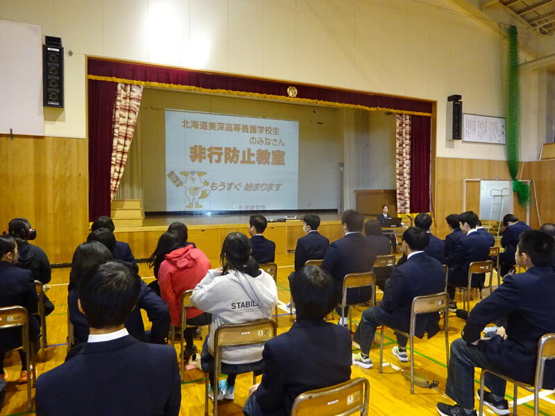 11月27日(木)に本校体育館にて生活安全教室を行いました。名寄警察署から講師をお招きし、インターネットを介したトラブルの事例について講話をいただきました。その後、「画像を送信してほしいと言われた場合どのような対処があるのか」というテーマでグループワークを行い、自分たちができる対処方法や予防方法を考え発表しました。自分たちが正しくインターネットを利用していくために、生徒たちは真剣に意見を交わしながら学習を進めていました。